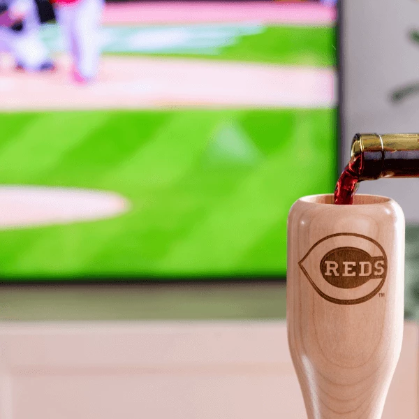 The Cincinnati Reds Wined Up® – a mini baseball bat wine glass. This 100% birch wood mini baseball bat is perfect to sip from on the patio, sitting poolside, while watching the “big game”, or even tailgating.